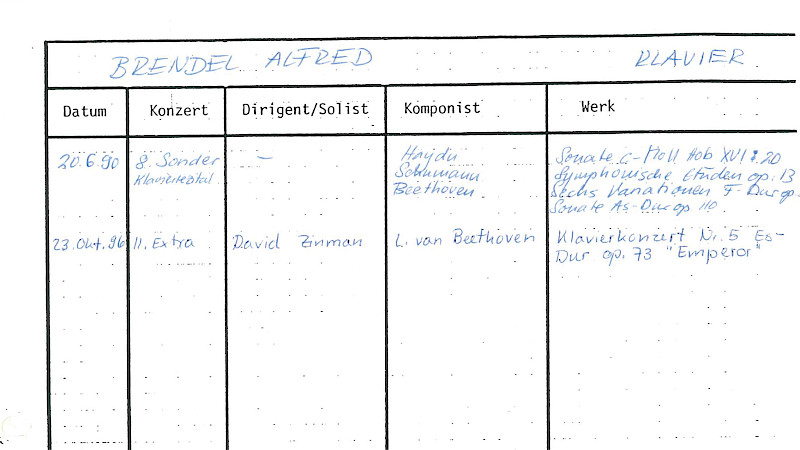 What this meant could also be experienced in the Tonhalle Zurich from 1962. Alfred Brendel's first appearance here, which is still documented by hand in the archives, was under the direction of Hans Rosbaud. This was followed by very sporadic concerts until 1996, when his regular collaboration with David Zinman began.