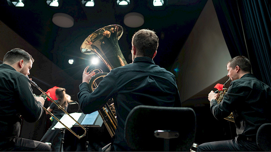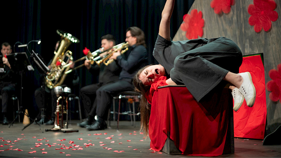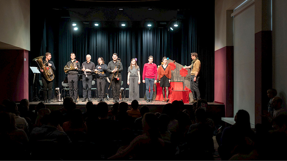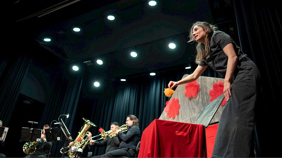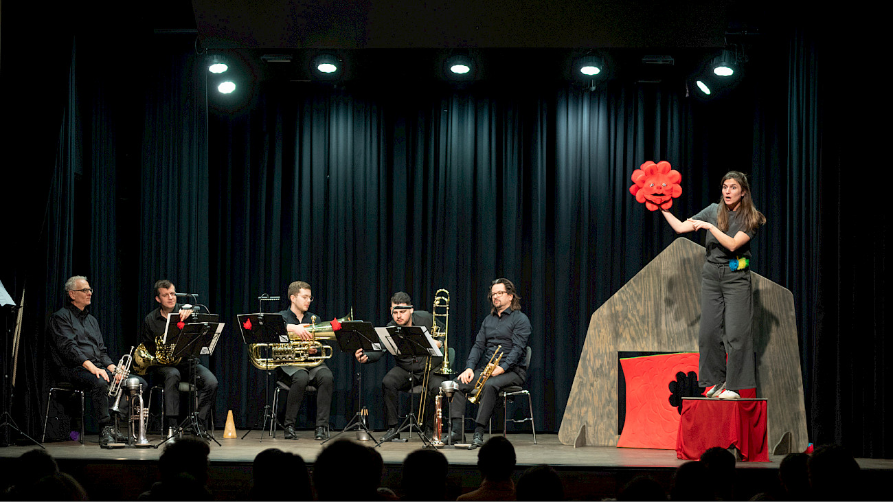 Heinz Saurer Trompete, Joaquin Eustachio Romano Trompete, Tobias Huber Horn, Marco Rodrigues Posaune, Christian Sauerlacher Tuba, Madeline Engelsman Schauspiel, Nelly Danker Konzept, Text, Jeroen Engelsman Regie, Anna Nauer Ausstattung Kunterwunderbunt