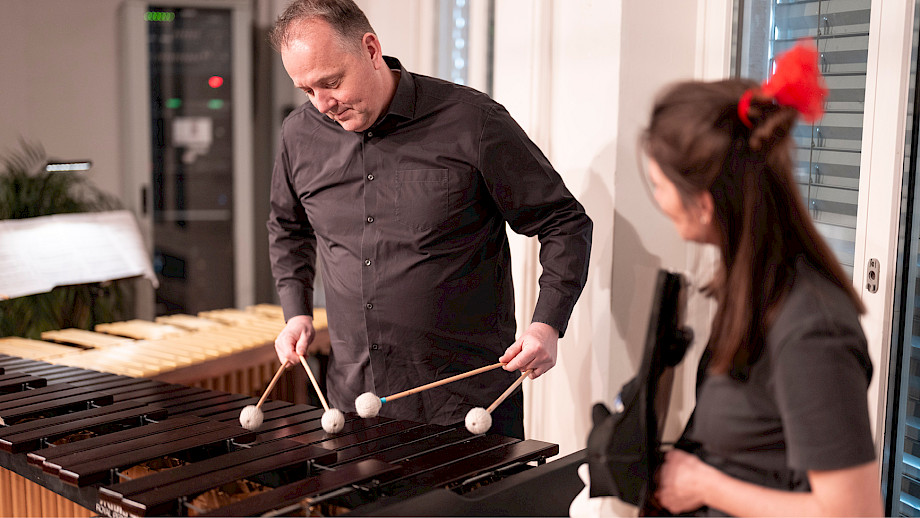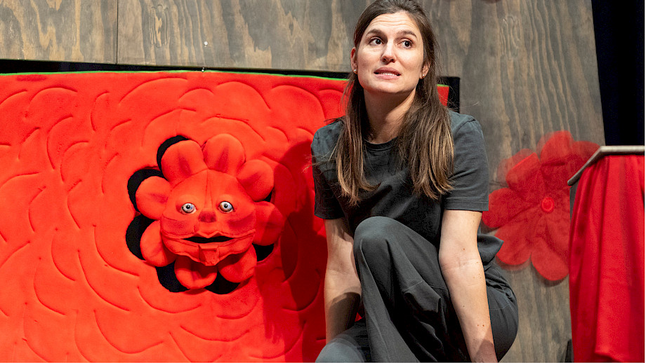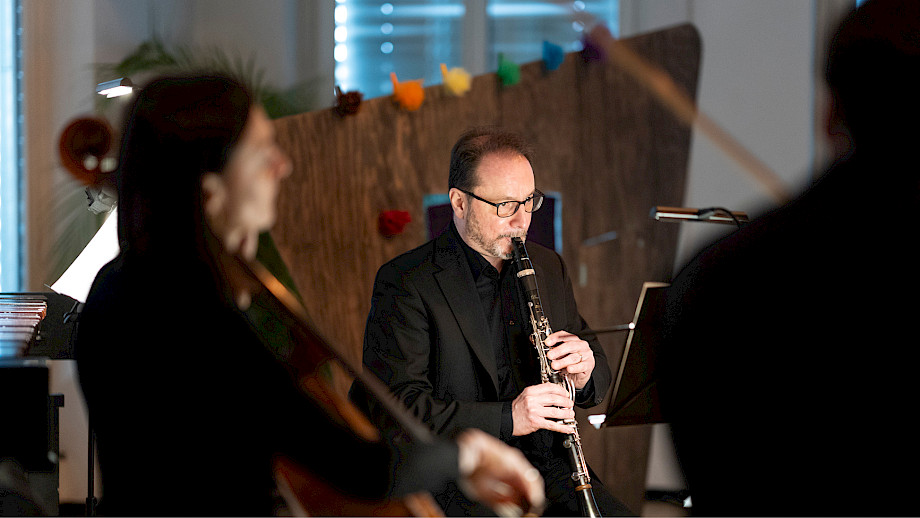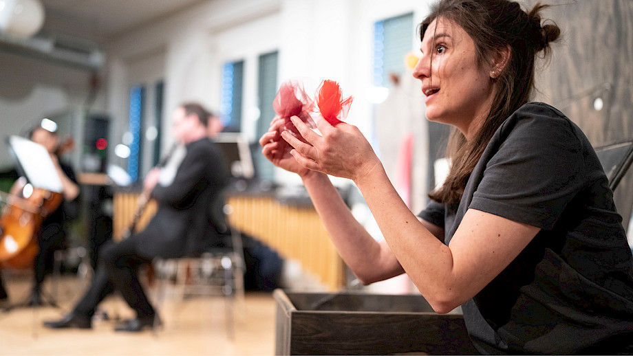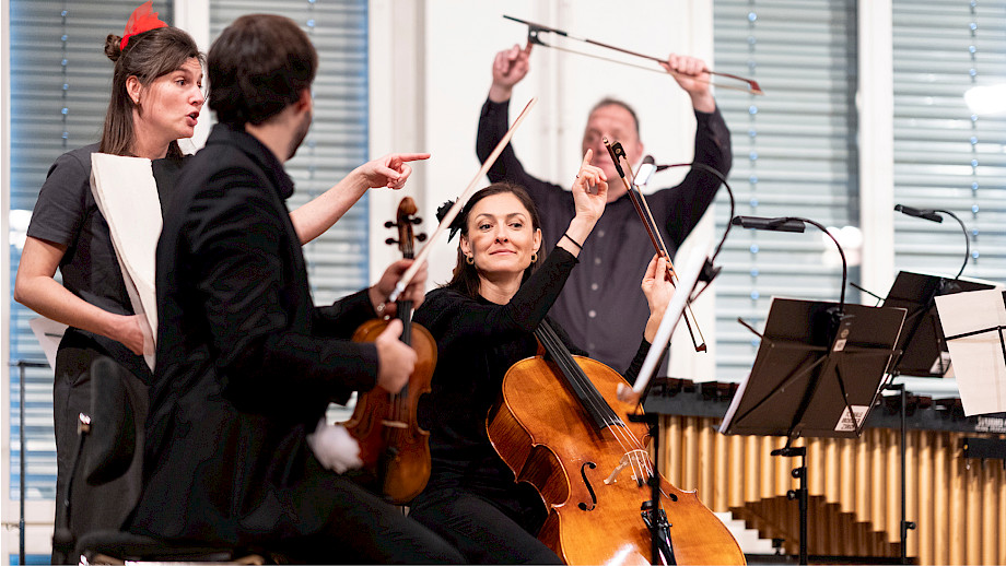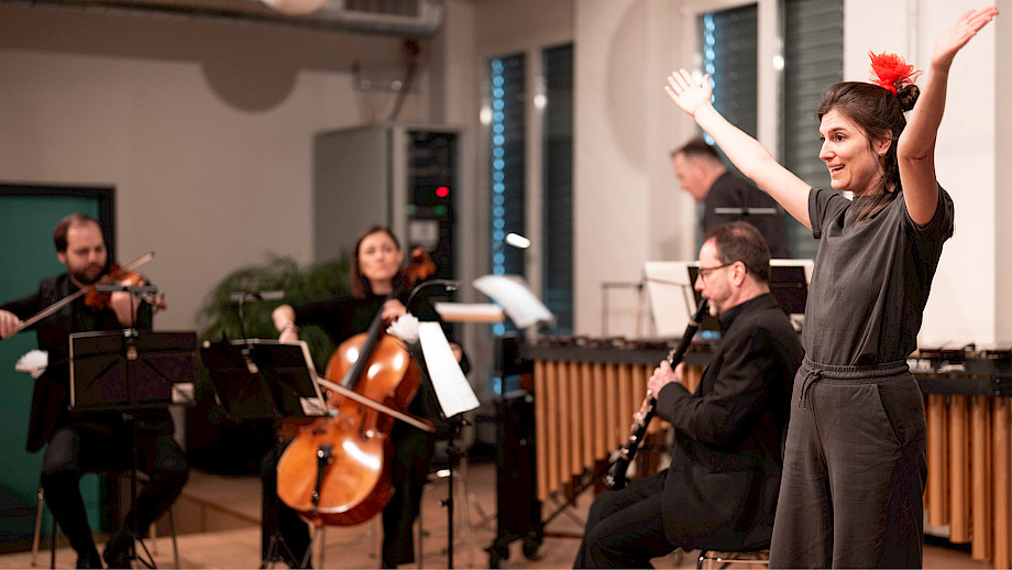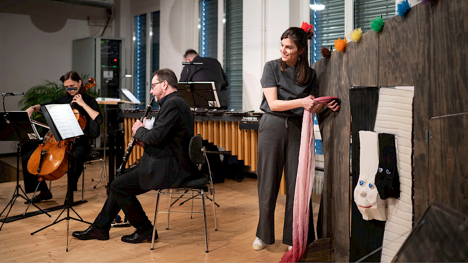 Diego Baroni Klarinette, Philipp Wollheim Violine, Ioana Geangalau-Donoukaras Violoncello, Christian Hartmann Marimba, Madeline Engelsman Schauspiel, Nelly Danker Konzept, Text, Jeroen Engelsman Regie, Anna Nauer Ausstattung Kunterwunderbunt