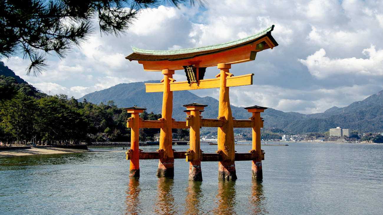 Das Zinnoberrot sticht von Weitem aus dem Meer und der umliegenden Landschaft heraus, bei Ebbe kann man es aus nächster Nähe sehen: das sechzehn Meter hohe Torii auf der japanischen Insel Miyajima. Es ist eine der grössten Touristenattraktionen Japans und das Postkartenmotiv schlechthin. Torii sind heilige Tore und stehen am Eingang von Shintō-Schreinen. Sie markieren die Grenze zwischen der profanen und der sakralen Welt und zeigen den Göttern den Weg zur Tempelanlage. Auch Olivier Messiaen (im Bild links mit seiner Frau Yvonne Loriod) muss das rote Torii 1962 auf seiner Hochzeitsreise gesehen und sich bei diesem Anblick inspiriert gefühlt haben – und zwar so sehr, dass er es zum Titel des fünften Satzes seines Werks «Sept haïkaï. Esquisses japonaises » machte, das ein Jahr später uraufgeführt wurde.