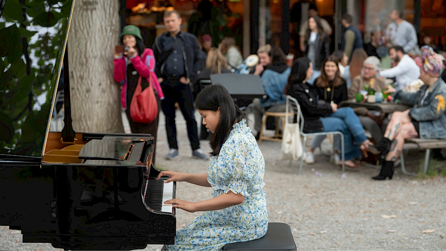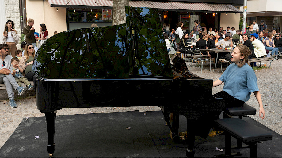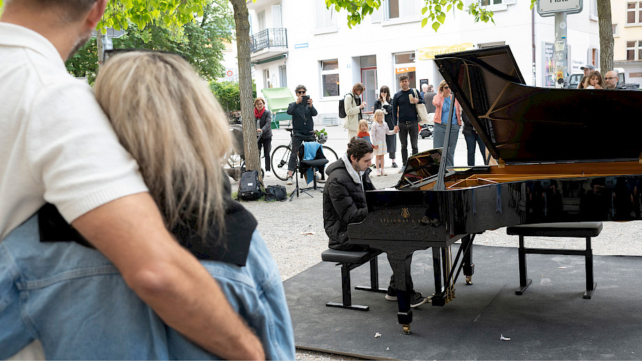 Er blieb nicht allein. Auch viele andere nutzten die unerwartete Spielmöglichkeit, teilweise sogar mehrmals: Einige spielten Pop-Arrangements, andere Jazziges oder Klassisches, manche sangen dazu. Und darum herum wuselten Kinder und Hunde, Leute stiegen von ihren Velos und hörten eine Weile zu, andere setzten sich ins Strassencafé. Und Marienne Montero – Sängerin, Pianistin und Gewinnerin des Kleinen Prix Walo – machte selbst dann noch weiter, als es ganz entgegen den Wettervorhersagen zu regnen begann: Es waren genügend Leute da, die eine Blache über den Flügel hielten.