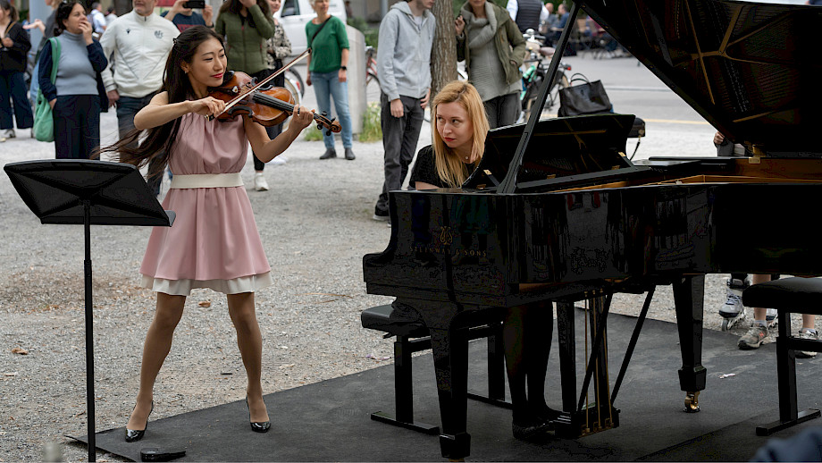 Neben dem Klavier bekam das Publikum übrigens auch eine Violine zu hören: Unsere Geigerin Irina Pak spielte sich zusammen mit der Pianistin Kateryna Tereshchenko von Vivaldi bis Adele durch die Stile und Jahrhunderte. Wer weiss, ob das kleine Mädchen, das sich mit grossen Augen gleich neben sie stellte, eher die Musik oder das schöne rosa Kleid bewunderte … Sicher ist: Es war für viele und auch für uns ein besonderer Samstagnachmittag auf dem Brupbacherplatz. Fortsetzung folgt!