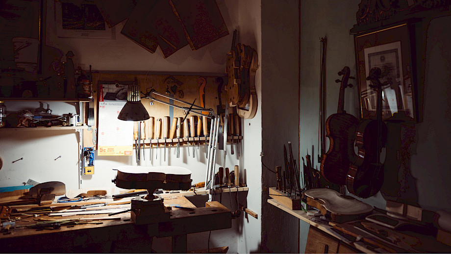 Ihre Werkstatt ist deutlich geräumiger als jene von Katharina Abbühl. Der Eingangsraum ist verziert mit Holzarbeiten des Vaters, der den Weg vom Baum bis zur Violine in Reliefs geschnitzt hat. Im hinteren Zimmer hängen ein paar Geigen an einer Leine, in einem Apothekerschrank sind Gläschen und Fläschchen mit Lacken und Harzen aufgereiht. Im Raum dazwischen steht der Arbeitstisch, eine Tischlampe sorgt für gedämpftes Licht – und Vincenzo Bissolotti muss ein paar Schalter ausprobieren, bis er jenen für die Deckenbeleuchtung findet, um uns zu zeigen, warum er diese nie einschaltet: «Man sieht nichts, wenn es zu hell ist, die Strukturen des Holzes sind gar nicht mehr zu erkennen.»