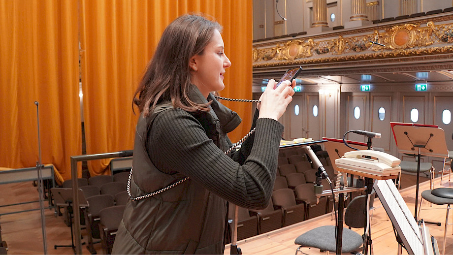 12:20 Erneuter Wechsel in die Tonhalle, Assistant Conductor Julia Kurzydlak stellt sich probehalber vor das Tuch. Doch, das könnte funktionieren.