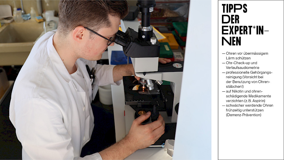 Thanks to research, new findings are constantly being made about this fragile structure in the human head, says Bächinger: "What we haven't known for so long: The most vulnerable point in the ear is the connection between the nerve fibre and the hair cell, i.e. the plug of this cable into the hair cell, so to speak. And we now know that these structures are already damaged at significantly lower sound levels than the hair cells. This means that the hair cells then lose some of their attached nerve fibres, which leads to more complex functions such as speech comprehension being impaired. And it is also assumed that tinnitus can be caused by this."