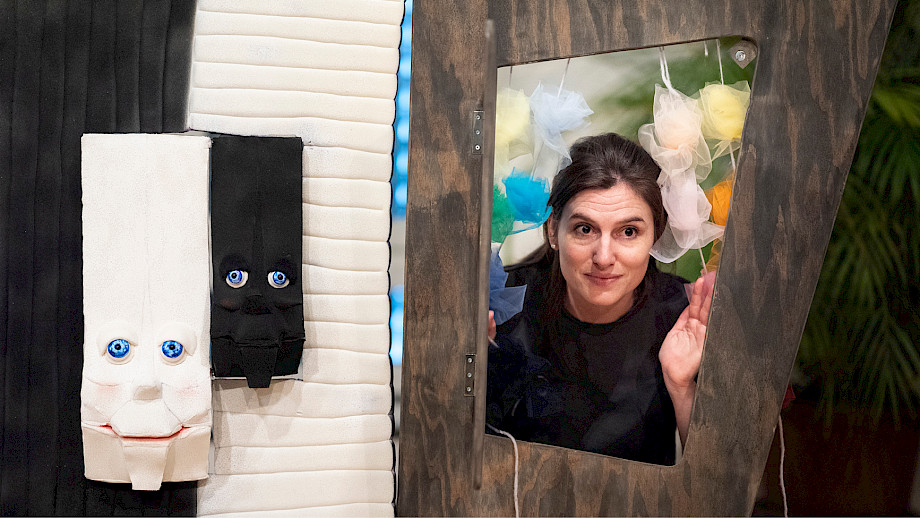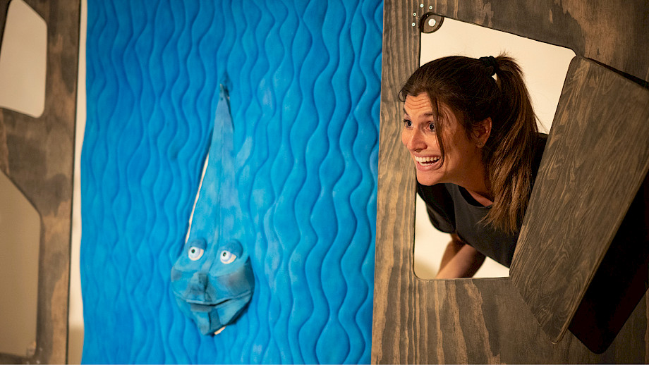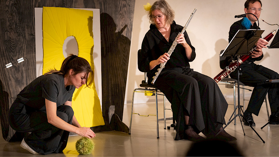 Diego Baroni Klarinette, Philipp Wollheim Violine, Ioana Geangalau-Donoukaras Violoncello, Christian Hartmann Marimba, Madeline Engelsman Schauspiel, Nelly Danker Konzept, Text, Jeroen Engelsman Regie, Anna Nauer Ausstattung Kunterwunderbunt