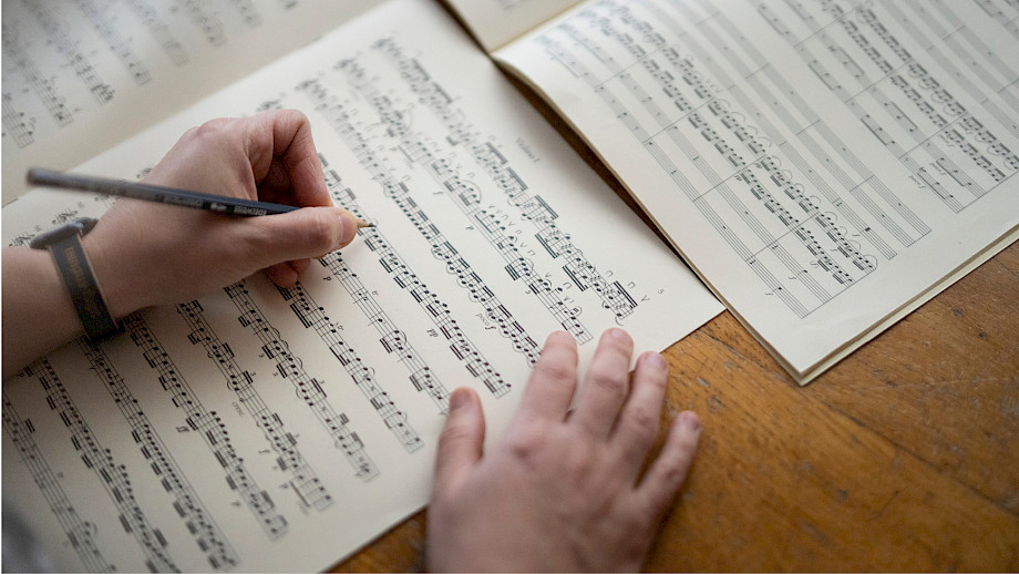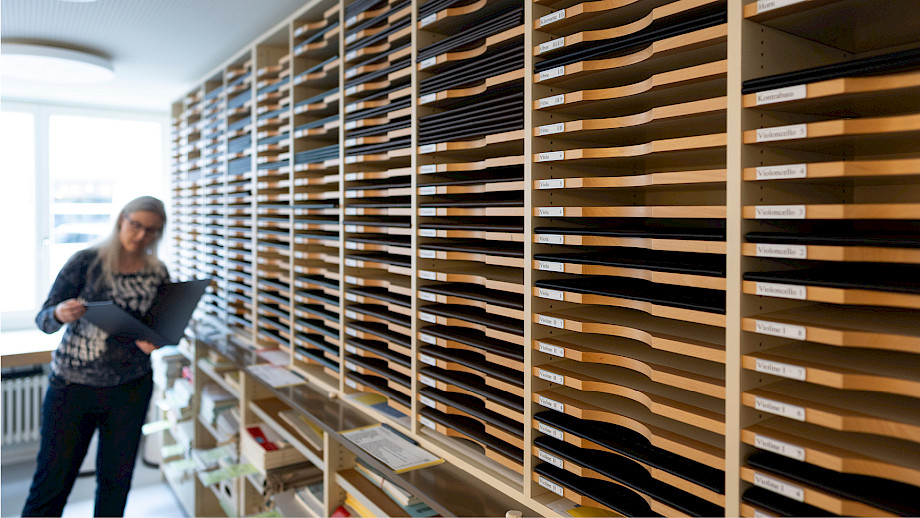 Die Aufgaben einer Orchesterbibliothekarin sind vielfältig. Sie plant und organisiert, recherchiert, dokumentiert, ist handwerklich tätig, und regelmässig steht das Bezeichnen auf der Tagesordnung. Genauer gesagt: das händische Einfügen von Bogenstrichen, Dynamik- und Artikulationszeichen in das Notenmaterial mit einem Bleistift.