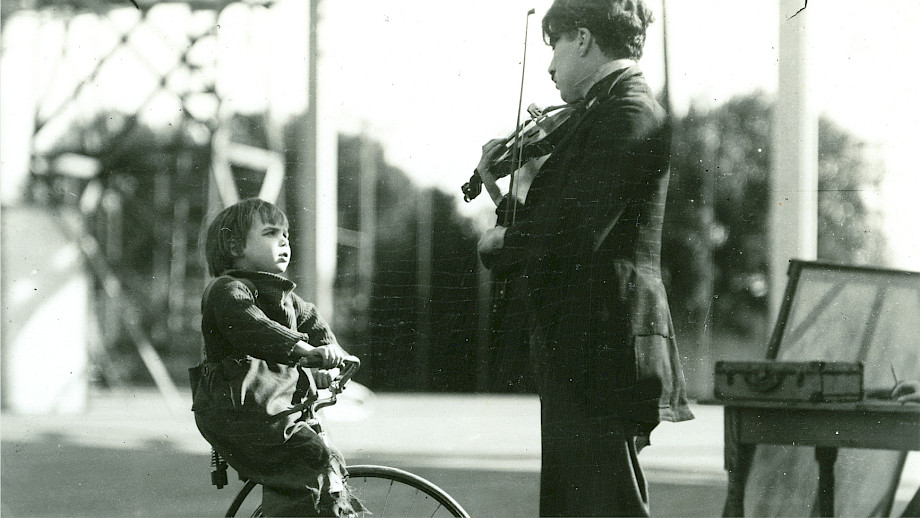 Tournee- und Theaterleben, der Sound der Music Halls – in diese Welt war Charles Spencer Chaplin junior 1889 hineingeboren worden. Beide Eltern waren Sänger und Songschreiber in London. Doch die Kindheit war auch geprägt von Armut und Aufenthalten in Internaten für Waisen und mittellose Kinder. Sein Halbbruder Sydney unterstützte Chaplin, war Vorbild und brachte ihn zur Karno-Truppe, die ihm auch die Welt zur Musik öffnete. Und so kaufte sich Chaplin mit 16 Jahren eine Geige und ein Cello, die ihn auf der Tournee begleiteten, und nahm Unterricht, bei wem er nur konnte. Chaplin selbst stapelte tief: «Gut posieren» könne er mit dem Cello, «aber das ist auch schon alles». Über den Geiger Chaplin sagte sein Wegbegleiter Stan Laurel, dass er «stundenlang» geübt habe: «Ich würde ihn nicht als guten Geiger bezeichnen, aber er war ganz sicher kein schlechter.» Ausserdem spielte er Saxophon und Klavier.