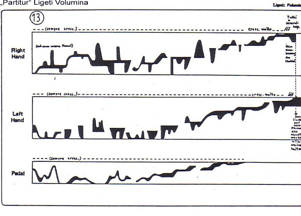 Was er entdeckte, beschrieb er selbst als «leere Form», als «neutralisierten Klang», als «etwas zwischen Klang und Geräusch». Es gibt weder Melodien noch Harmonien in dem Werk, auch keinen Rhythmus. Es sind Cluster, Tonballungen, die sich in «Volumina» durch den Raum schieben; dabei werden die «labyrinthischen Bewegungen» (Ligeti) nicht nur mit den Fingern und Füssen gestaltet, sondern auch mit den ganzen Handflächen oder den Unterarmen.