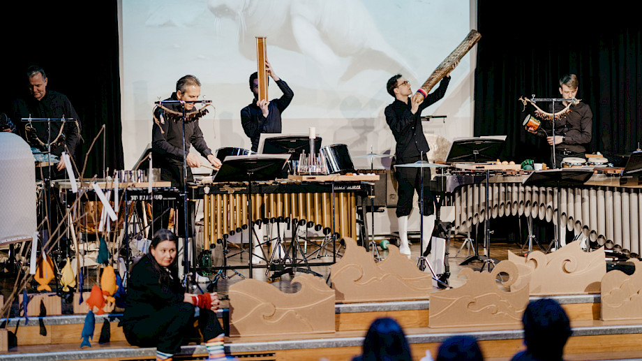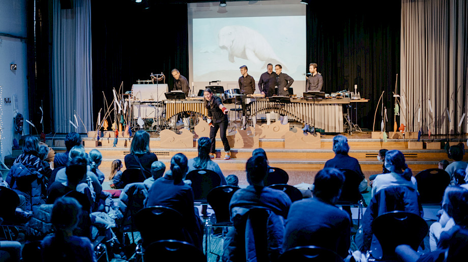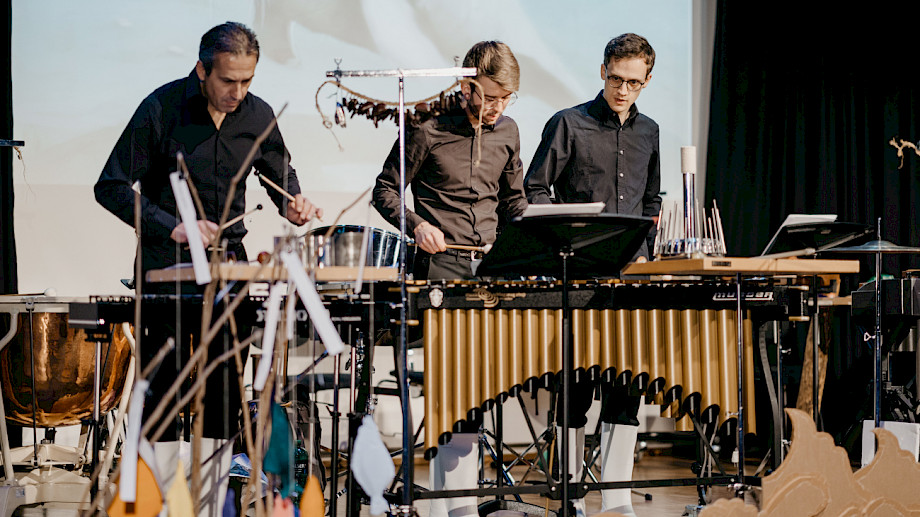 Christian Hartmann Perkussion, Klaus Schwärzler Perkussion, Tilmann Bogler Perkussion, Janic Sarott Perkussion, Jonas Elmiger Perkussion, Andreas Berger Schlagzeug, Sabine Bierich Moderation, Dramaturgie, Anna Nauer Ausstattung, Janina Kriszun Konzept Hess