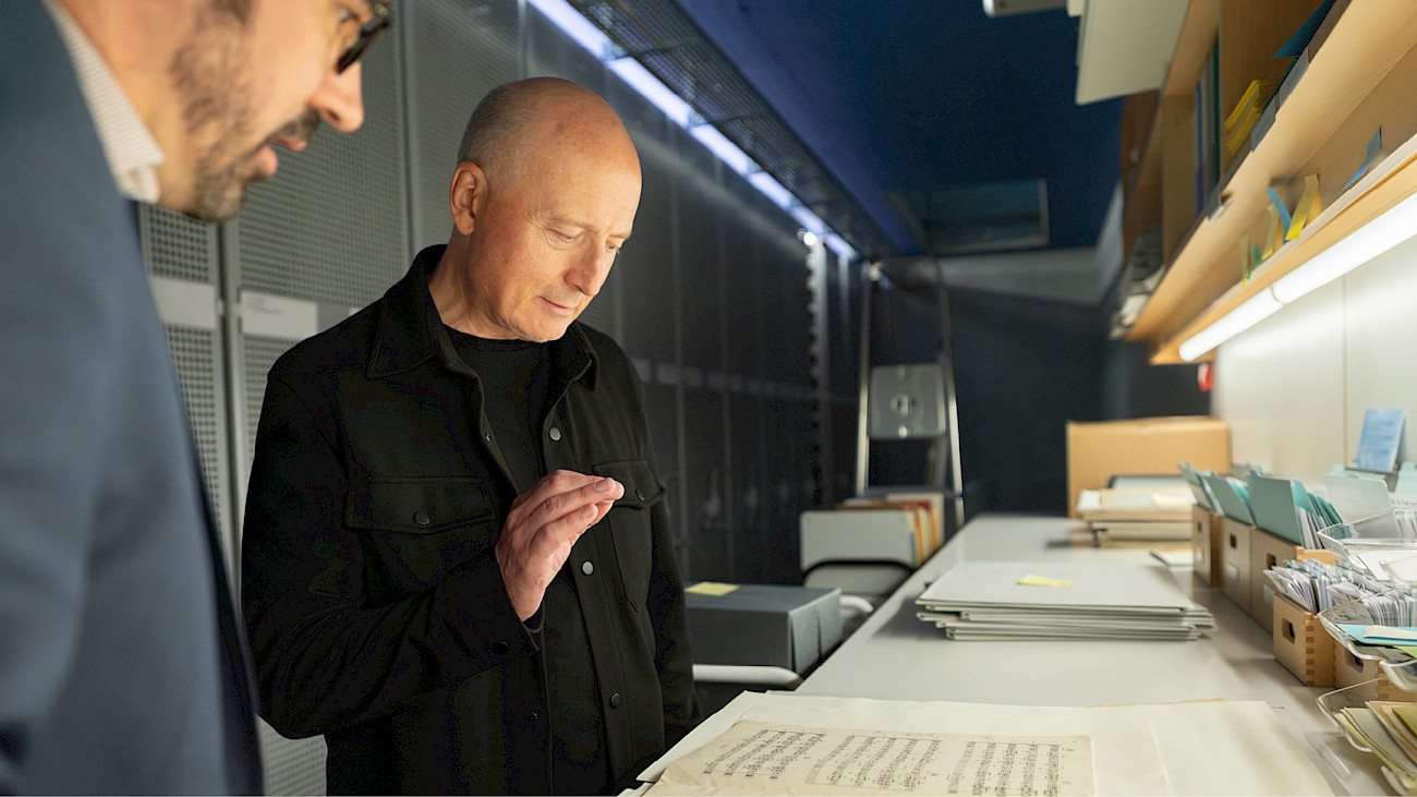 Auf dem Weg in Richtung Keller, wo «ein besonderes Geburtstagsgeschenk Paul Sachers auf uns wartet», deutet Besthorn auf Kisten mit neu eingetroffenem Material, die sich stapeln: «Hier sammelt sich schon einiges an. Und es braucht Zeit, alle Neueingänge zu sichten und angemessen einzupflegen.» Paavo Järvi hat sich gewünscht, noch einige Originalpartituren mit den Eintragungen von Komponist*innen und Interpret*innen zu sehen. Deswegen sind wir jetzt im untersten Geschoss angelangt. «Gleich wird es kalt!», warnt uns Besthorn vor. Dann betreten wir den klimatisierten Kulturgüterschutzraum.